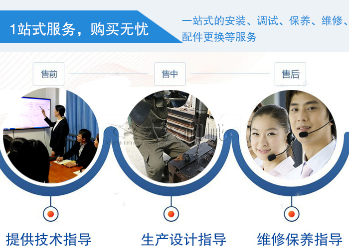 廠家提供免費(fèi)選型指導(dǎo),用戶也可以帶料試機(jī),車接車送,也可就近安排現(xiàn)場(chǎng)考察,一站式的安裝、調(diào)試、保養(yǎng)、維修、配件更換等服務(wù),讓客戶購買、使用設(shè)備更放心,24小時(shí)x7全方位服務(wù),我們隨叫隨到。