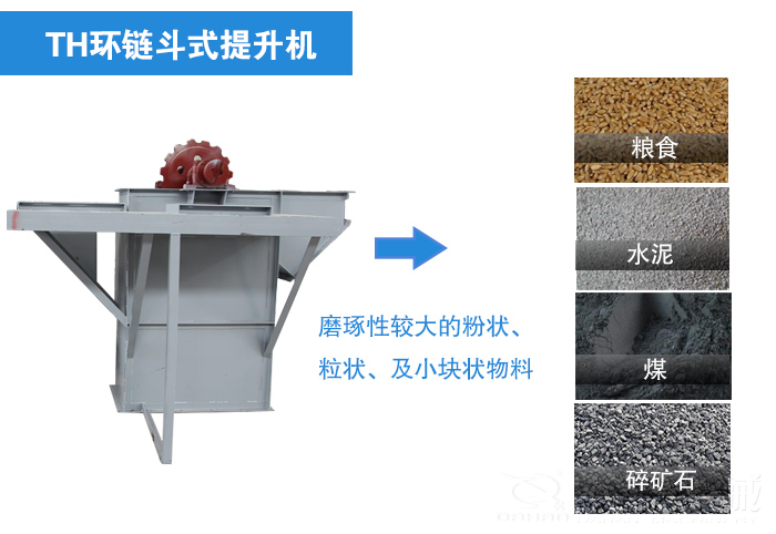 TH系列斗式提升機(jī)是一種常用的提升設(shè)備,其主要由由運(yùn)動(dòng)部分(料斗與牽引鏈條)、帶有傳動(dòng)鏈輪的上部區(qū)段、帶有拉緊輪的下部區(qū)段、中間機(jī)殼、驅(qū)動(dòng)裝置、逆止制動(dòng)裝置等組成,該種類的斗式提升機(jī)采用混合式或重力卸料,挖取式裝料。TH型區(qū)別于TD型皮帶斗式提升機(jī),其提升量更大、運(yùn)轉(zhuǎn)效率更高,大輸送量5.4-2m3/h,大提升高度為50m。
