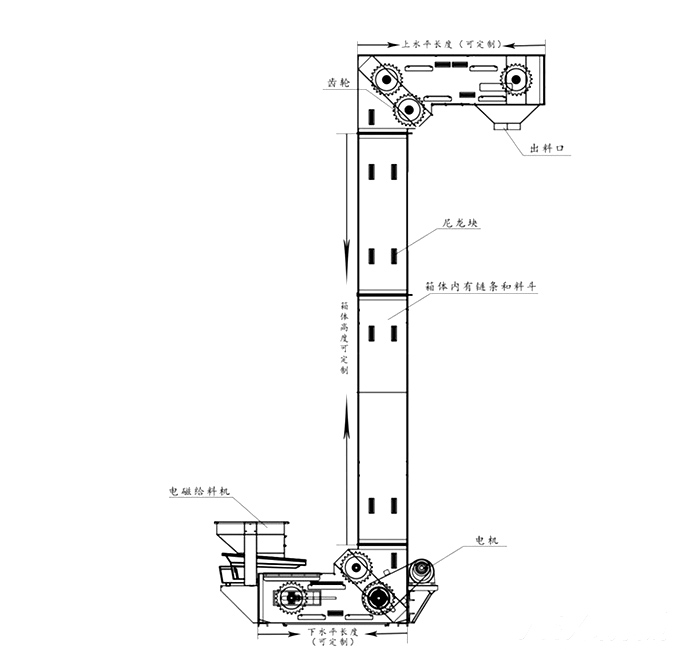 Z型斗式提升機可根據(jù)提升物料和用戶要求選擇不同的物料和配置。