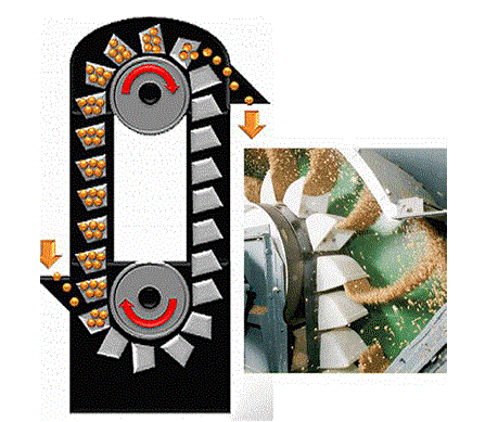 利用離心力將物料甩出卸料口。適用于提升速度快、干燥、小顆粒的場合。料斗的速度比較高,一般為每米1-2秒,要保持這個(gè)速度,必須選擇正確的驅(qū)動(dòng)輪,速度和直徑尤為重要,卸料口的選擇不容忽視。