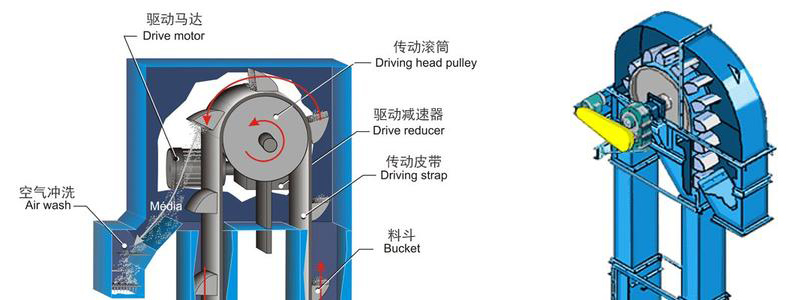 離心力+重力,適用于流動(dòng)性差、潮濕物料。 料斗一般選擇淺斗,分布方式為間隔性布局,以確保完成卸料。這種卸料方式融合了離心式和重力式兩種提升機(jī)的優(yōu)點(diǎn),適合絕大多數(shù)物料的輸送和提升。