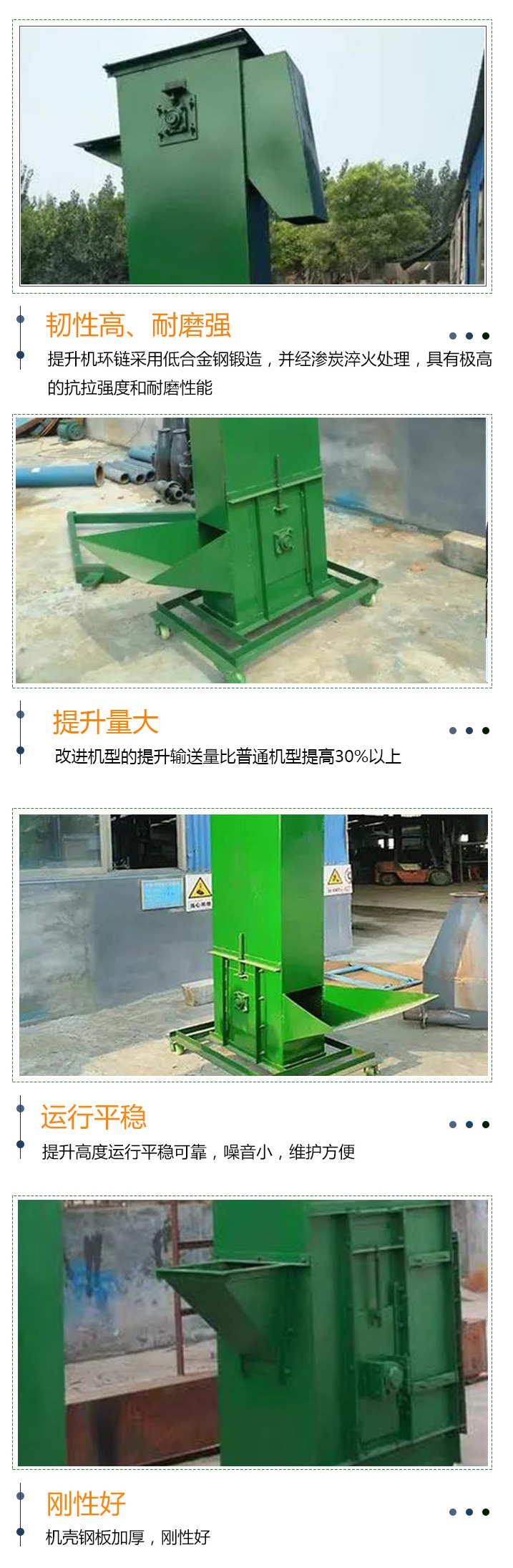 環(huán)鏈斗式提升機(jī)主要是依靠固定在鏈條上的料斗,將均勻流入尾部進(jìn)料口的物料從斗式提升機(jī)尾部不間斷地提升到斗式提升機(jī)頭部,并 然后從機(jī)頭出口卸下物料,完成整個物料提升過程。適合輸送堆積密度小于1.5t/m³易于掏取的粉狀、粒狀、小塊狀的低磨琢性物料 ,如:煤、水泥、碎石、砂子、化肥等,比普通機(jī)型提高30%以上。